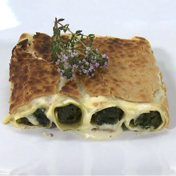 Canelones de espinacas con piñones y pasas gratinados en bechamel de tomillo y queso vegano