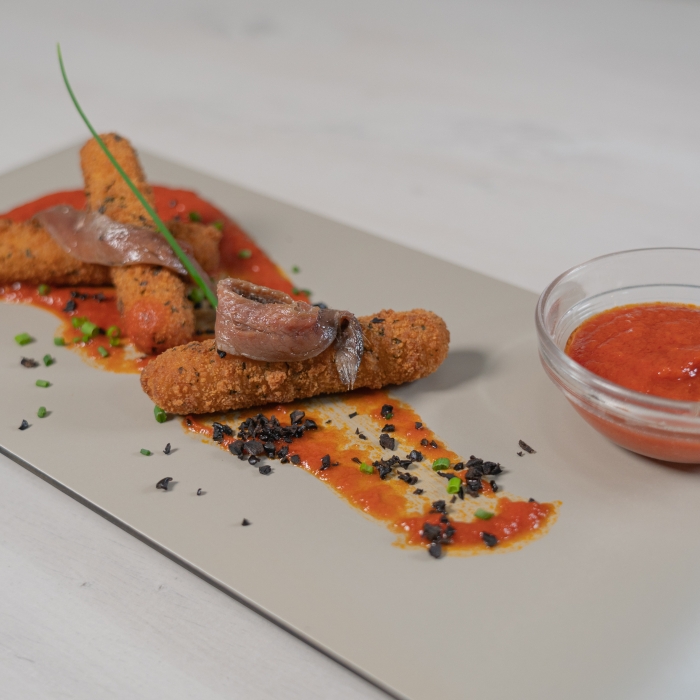 • Untamos salsa de tomate en el plato y colocamos los fingers encima.